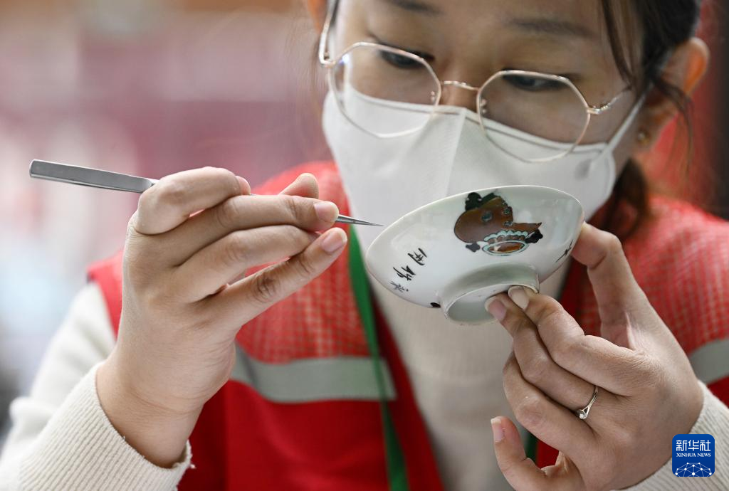 参加陶瓷文物修复师比赛项目的选手在现场进行文物修复(3月25日摄)。