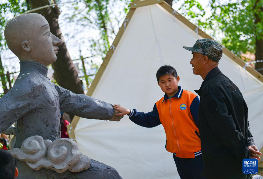 4月15日,村民在“2023下苑艺术生活季”活动现场观看雕塑作品。