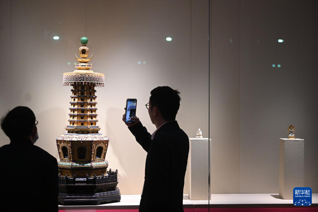 4月28日,嘉宾在北京故宫博物院参观金嵌宝石八角佛塔。