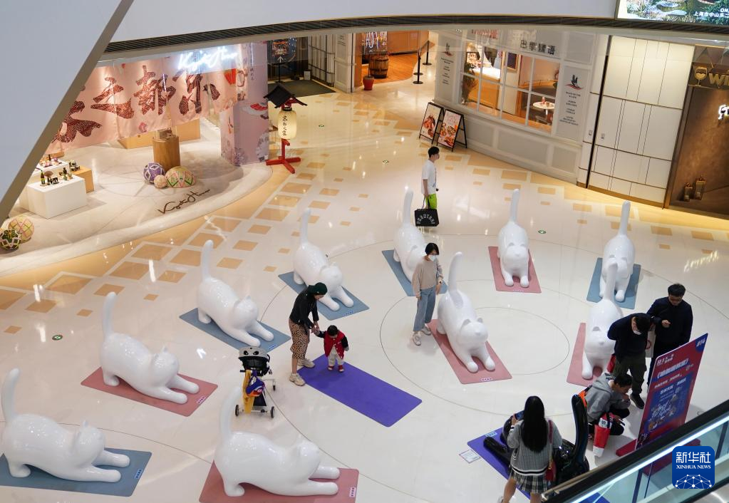 5月7日,游客在BFC外滩金融中心商场参观艺术装置《瑜伽猫教室》。