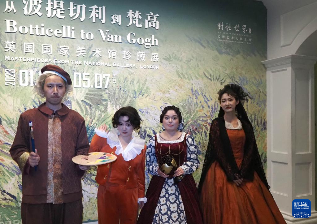 5月7日晚,上海博物馆工作人员扮演英国国家美术馆珍藏展作品中的人物形象在展厅入口欢迎观众。