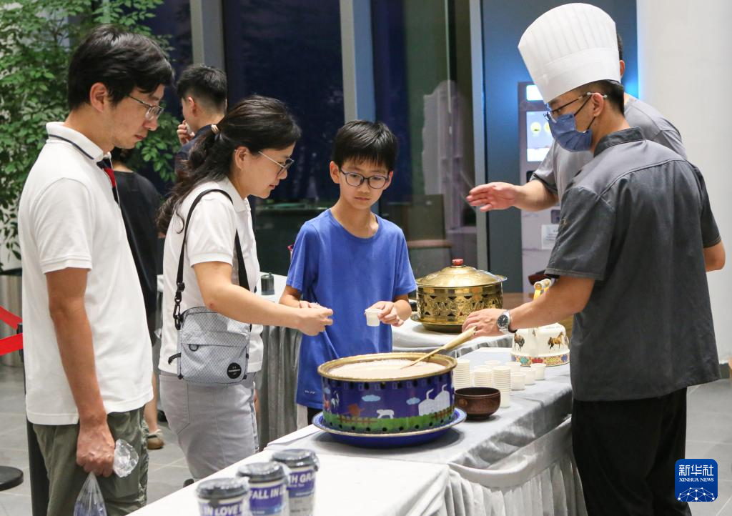 7月21日晚,游客在夜间“那达慕”大会上品尝奶茶。
