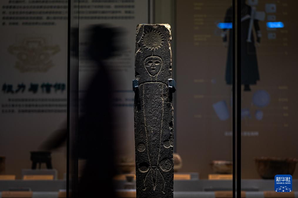9月23日,参观者在湖北省博物馆长江文明特展上观看展出的太阳人石刻。