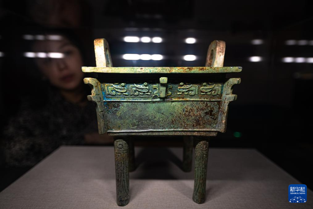 9月23日,参观者在湖北省博物馆长江文明特展上观看展出的束腰鳞纹铜升鼎。