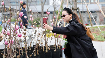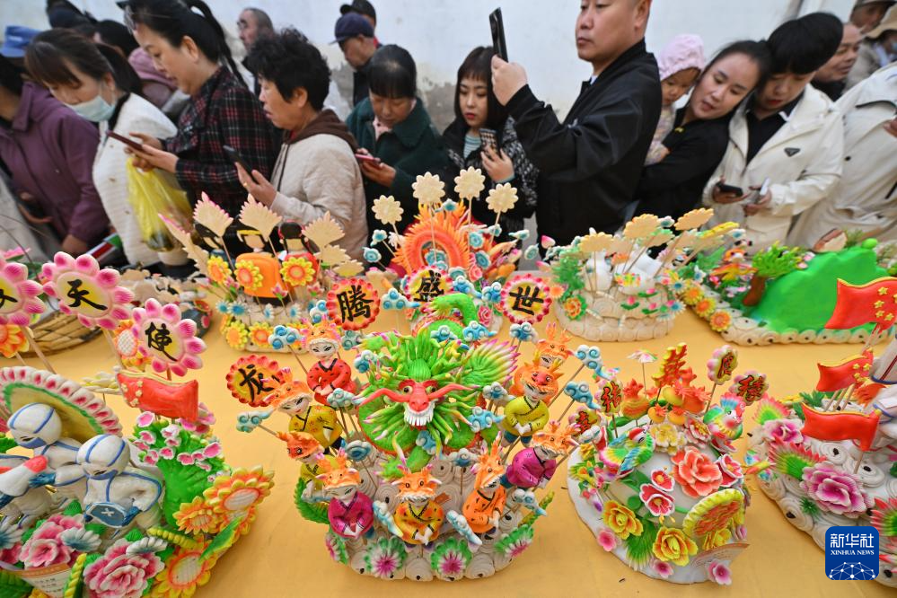 3月28日,在山西省岚县岚城镇,人们用手机拍摄面塑作品。