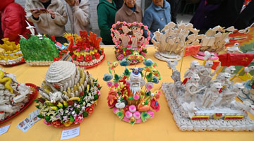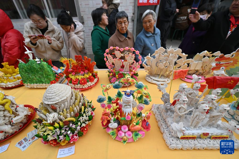 3月28日,在山西省岚县岚城镇,人们欣赏面塑作品。