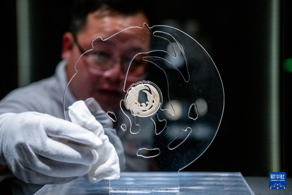 3月30日,工作人员在固定展品玉团凤。为迎接玉团凤,武汉盘龙城遗址博物院在玉团凤展柜上方将灯光布置成玉团凤形状。