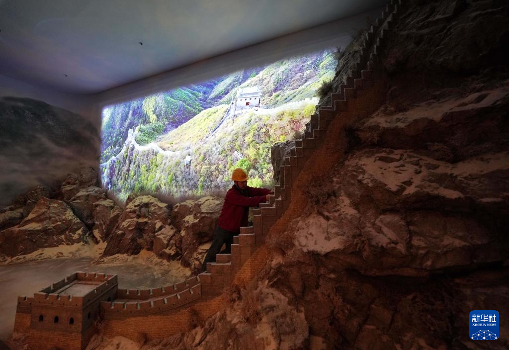 4月11日,工人在山海关中国长城博物馆展厅察看灯光效果。