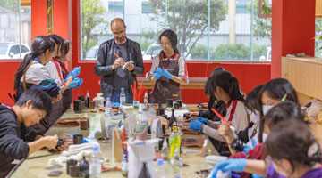 5月9日,法国漆艺家文森·漆(中)指导重庆市城口县职业教育中心学生练习上漆。