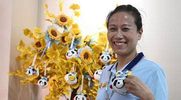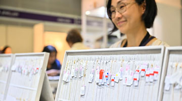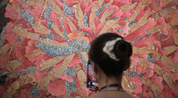 5月18日,家长带着孩子在福建省厦门市博物馆参观展出的漆线雕作品。