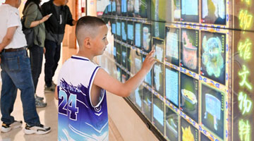 5月18日,小朋友在山东省滕州博物馆体验文物数字化展示。