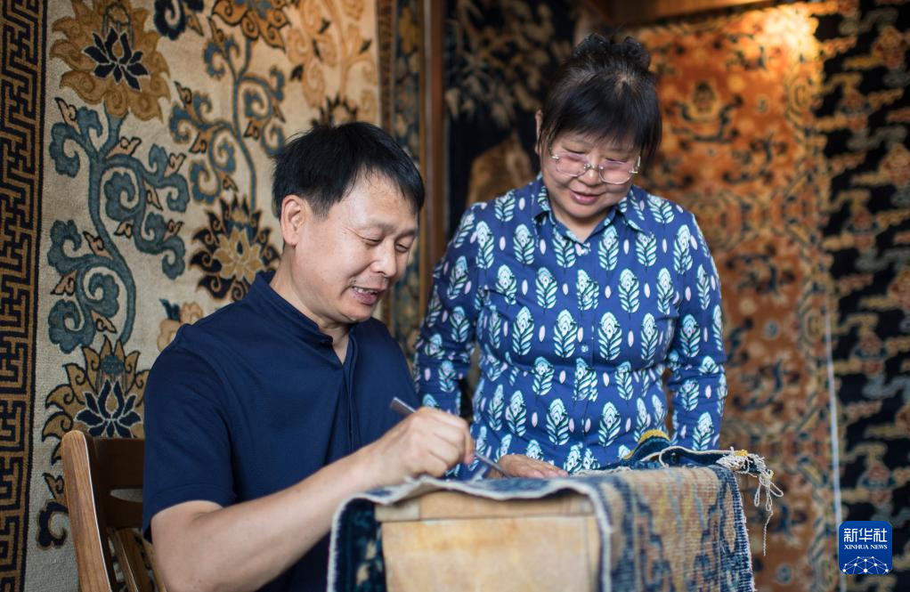 6月27日,国家级非物质文化遗产“宫毯织造技艺”代表性传承人王国英(右)在冀豫位于北京十里河的工作室内指导李东阳修复古毯。