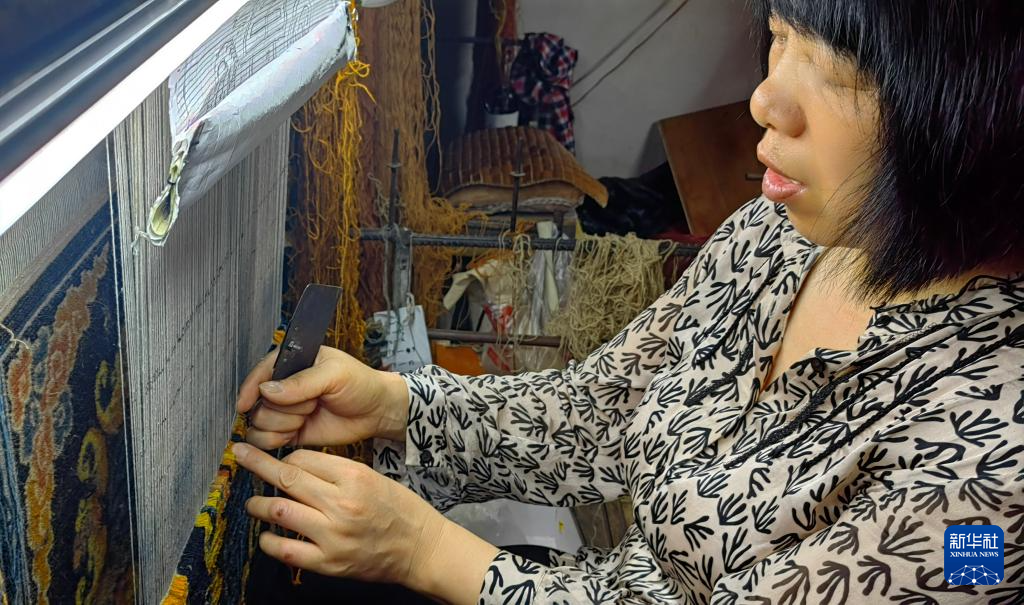冀豫在位于河南南阳的宫毯生产基地内用古法编织宫毯(资料照片)。