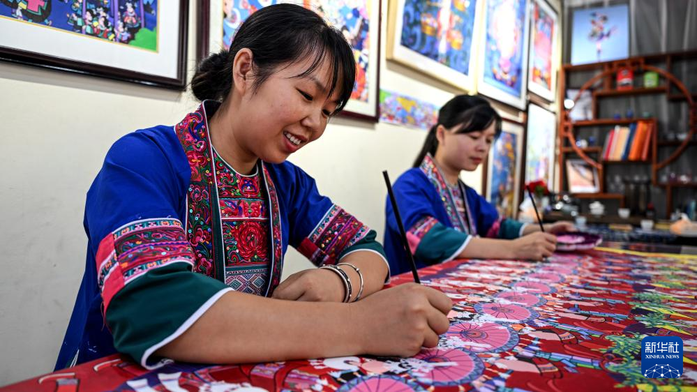 这是两位80后的侗族农民画代表陈美美(左)和荣雪莲在创作(9月11日摄)。