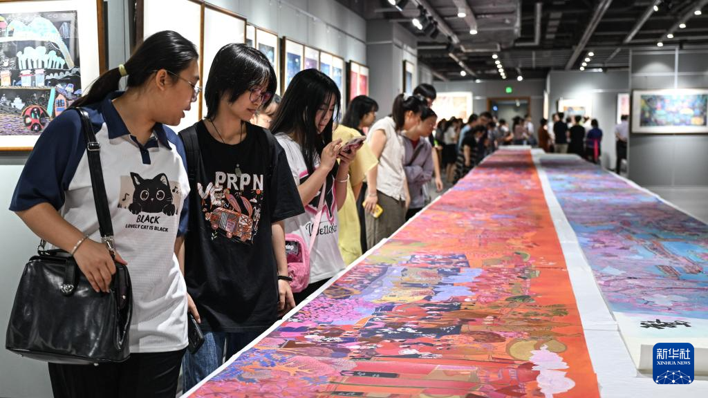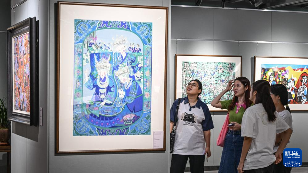 9月12日,游客在柳州市群众艺术馆观赏三江农民画。