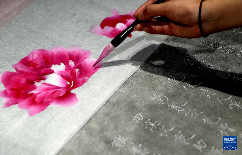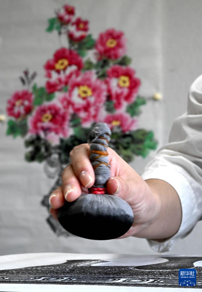 在洛阳龙门画院,钱夏玉在拓印完成的金石拓片上补绘牡丹画(9月11日摄)。