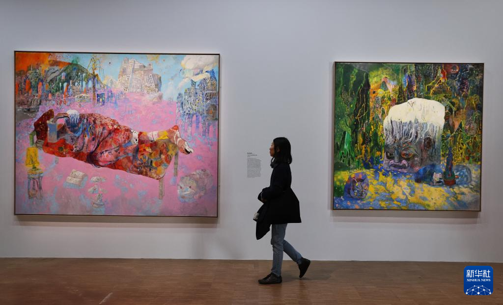 10月8日,媒体记者在法国巴黎蓬皮杜中心参观中国当代艺术家群展《目:中国境象》。
