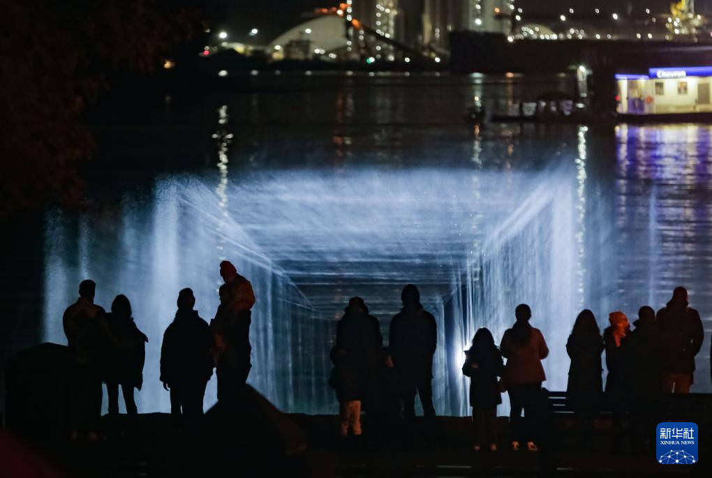 11月9日,在加拿大温哥华举办的灯光节上,人们观赏一个模拟极光的灯光装置。
