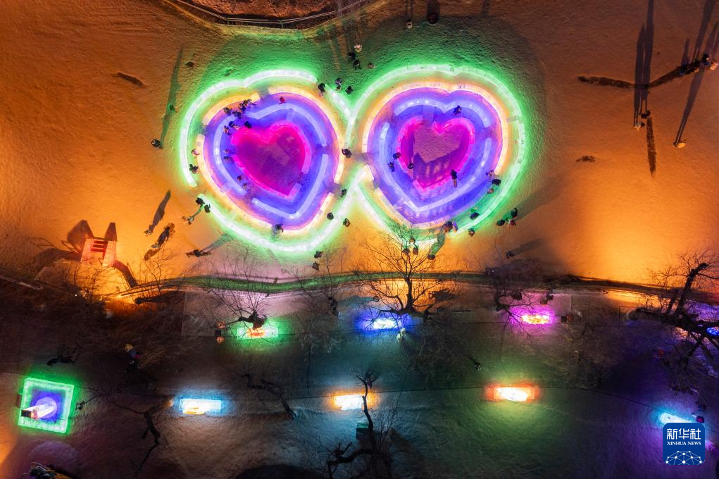 1月2日,在哈尔滨市兆麟公园,游客在冰灯艺术游园会园区内观赏冰灯(无人机照片)。