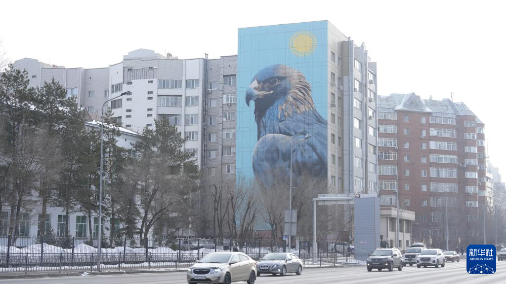 这是2月19日在哈萨克斯坦首都阿斯塔纳市老城区拍摄的居民楼外立面的墙绘。