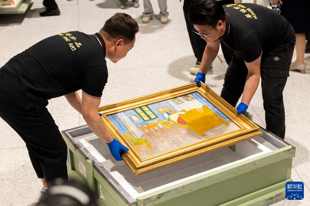 6月9日,工作人员在开箱仪式上搬运梵高的作品《梵高在阿尔勒的卧室》。