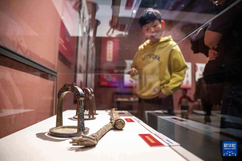 2月7日,在内蒙古博物院,小观众参观“马舞新春——丙午马年全球生肖文化联展”上展出的现代马鞭与近现代龙首铁马镫。