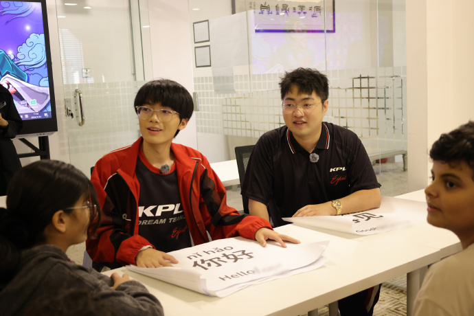 与其他国际队伍选手打乒乓球互动也成了KPL梦之队训练和比赛之余最爱参与的活动之一。除此之外,吴金翔(ID:清清)与教练唐田(ID:爱思)在沙特智慧宫国际中文教育利雅得学院参与交流;陈正正(ID:Cat)与东欧战队选手线下进行solo赛;李达亨(ID:小胖)、黄垚钦(ID:清融)、周诣涛(ID:钎城)等队员在场馆交流区学习阿拉伯语;赛前赛后杨涛(ID:无畏)、李达亨(ID:小胖)和其他队员们都大方展示英语……借助电子竞技这样快乐的交流每天都在发生。