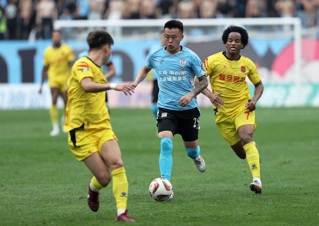 11月3日,大连英博队球员孙铂(中)在比赛中突破。当日,在大连举行的中甲联赛第30轮比赛中,大连英博队主场战胜上海嘉定汇龙队,从而以中甲联赛第二名的成绩获得下赛季中超联赛参赛席位。新华社记者 李钢 摄