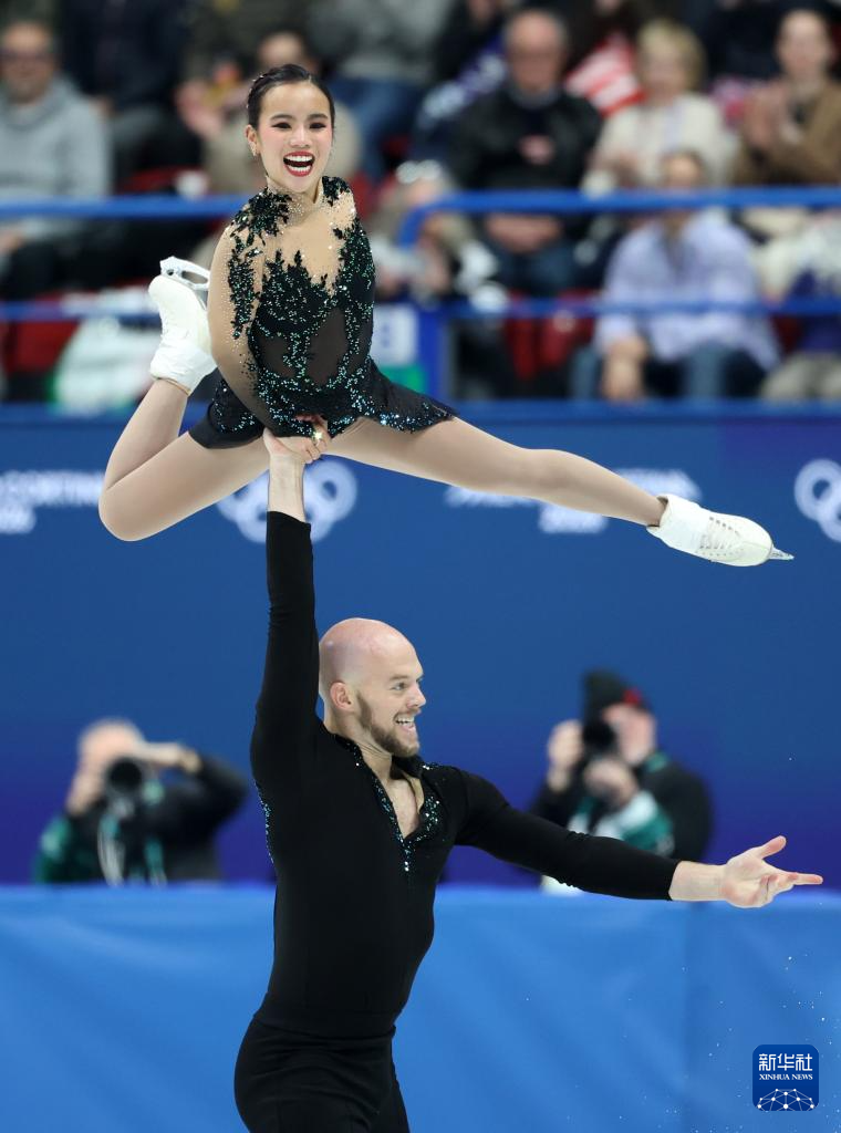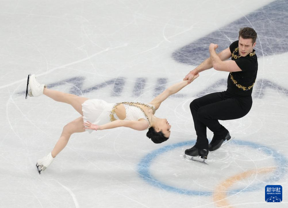 2月8日,加拿大队组合佩雷拉(左)/米肖在团体赛双人滑自由滑比赛中。