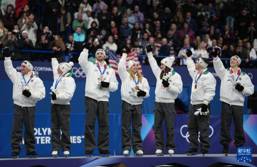 2月8日,美国队(中)、日本队(左)和意大利队在颁奖仪式上合影。