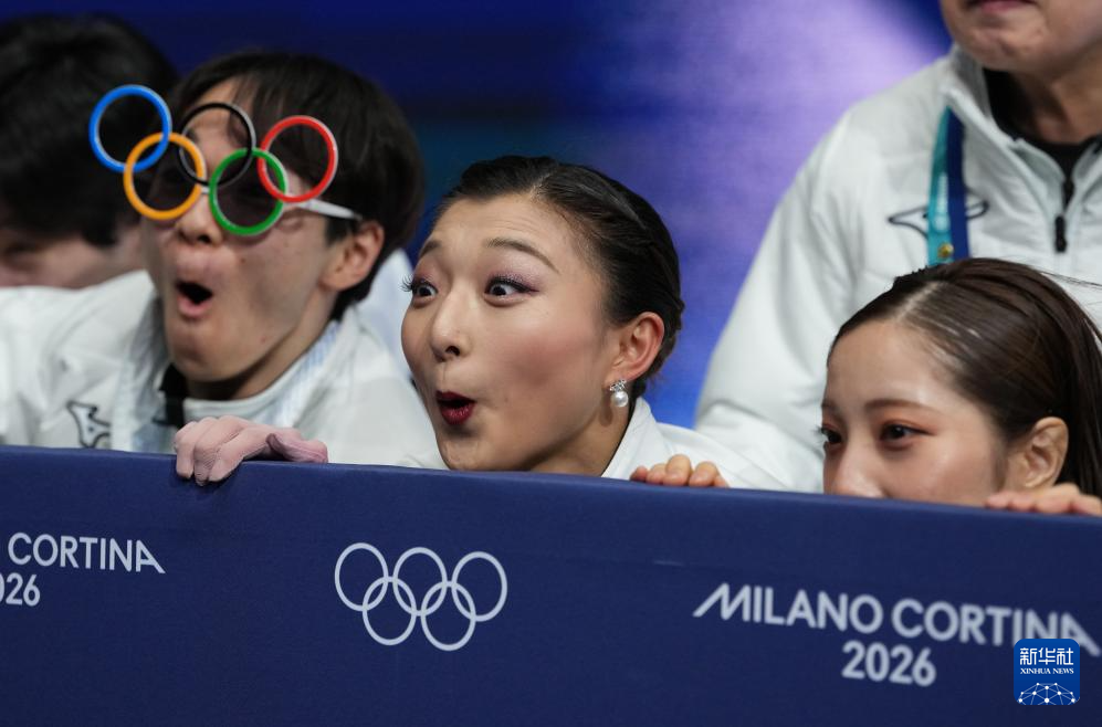2月8日,日本队选手坂本花织(中)在团体赛女单自由滑完赛后等待成绩。