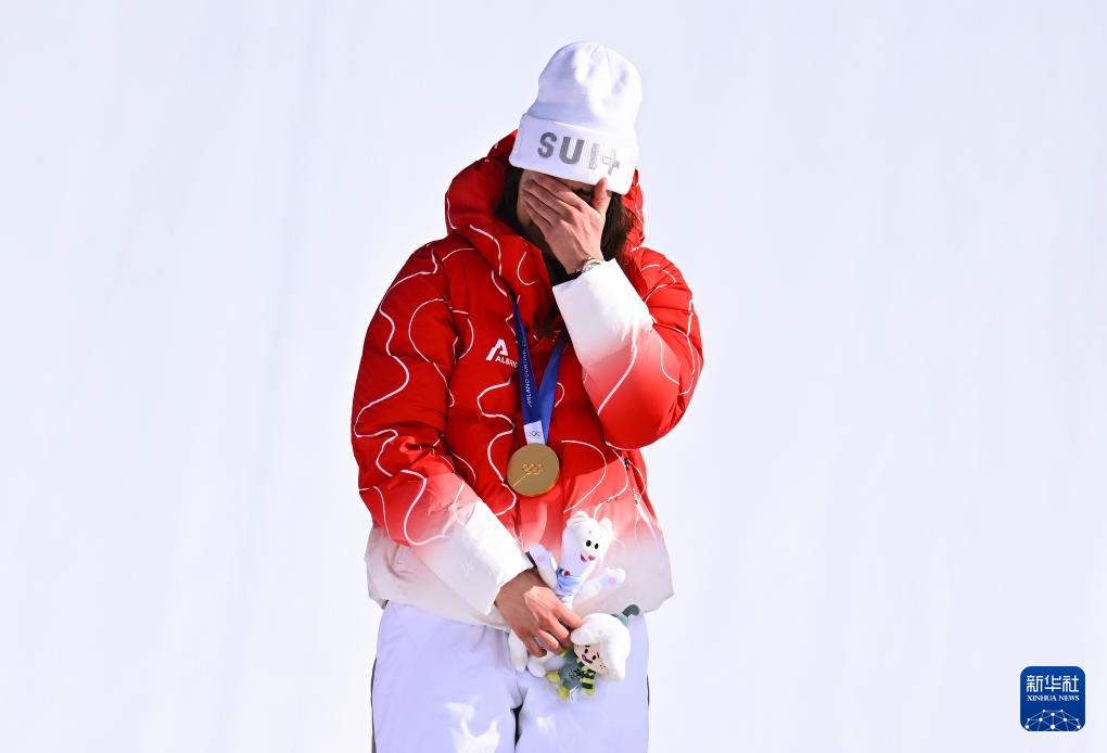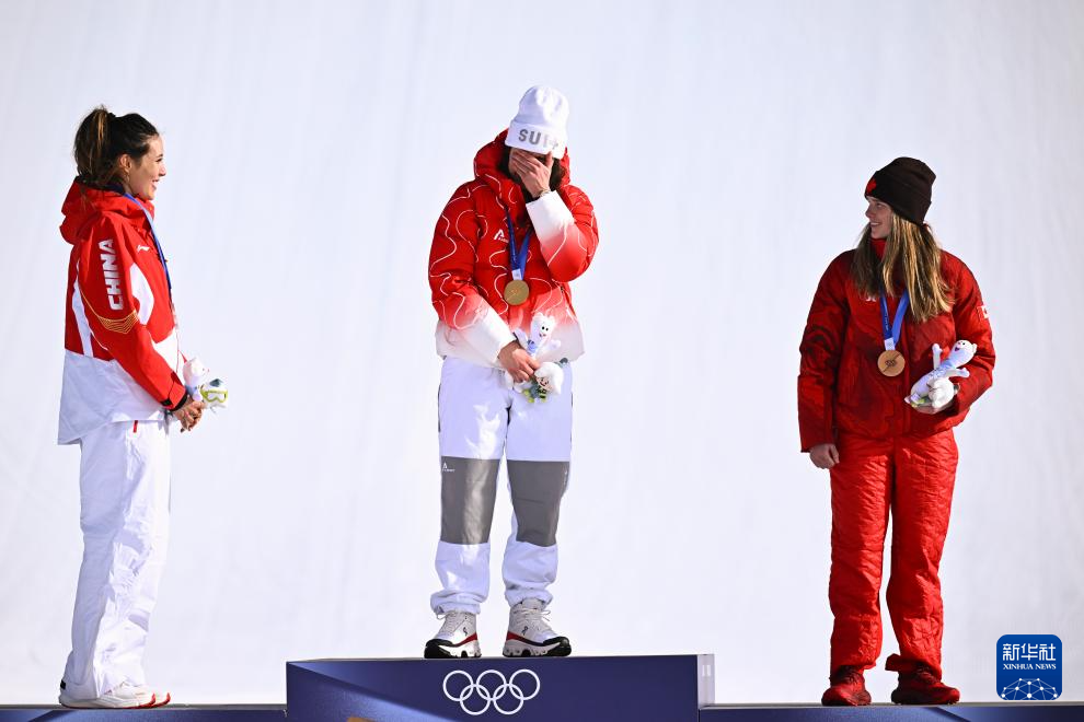 2月9日,冠军瑞士选手玛蒂尔德·格雷莫德(中),亚军中国选手谷爱凌(左)和季军加拿大选手梅根·奥尔德姆在领奖台上。