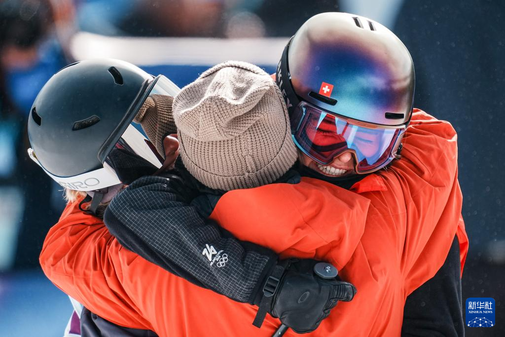 2月9日,瑞士选手玛蒂尔德·格雷莫德(右)在比赛中庆祝。她获得冠军。