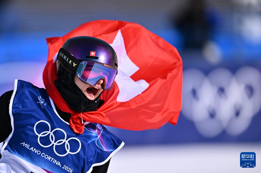 2月9日,瑞士选手玛蒂尔德·格雷莫德在比赛中庆祝。她获得冠军。