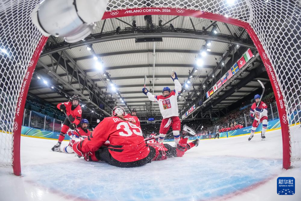 2月9日,捷克队球员姆林科娃(右二)在比赛中庆祝得分。