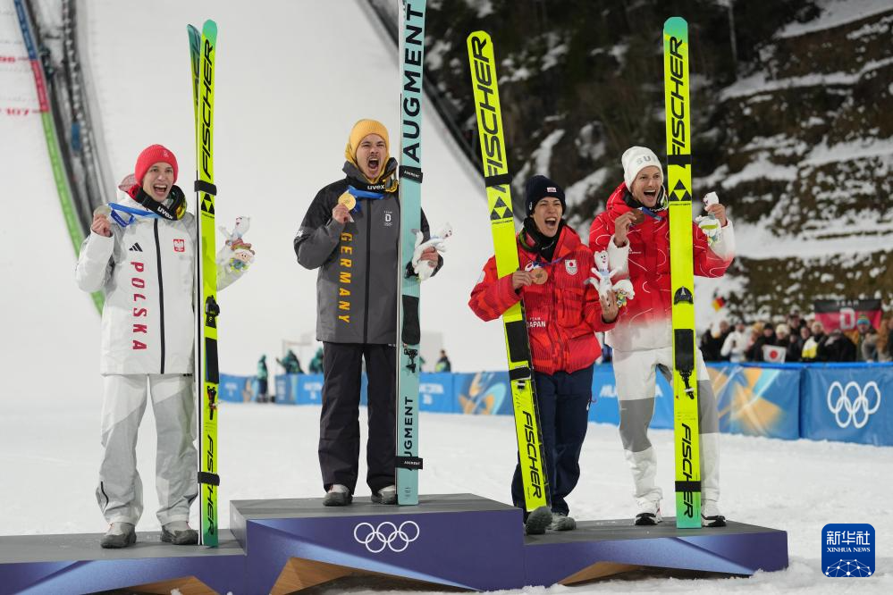 2月9日,冠军德国选手菲利普·雷蒙德(左二)、亚军波兰选手卡茨珀·托玛夏克(左一)、并列季军日本选手二阶堂莲(右二)与瑞士选手格雷戈尔·德施万登在颁奖仪式上。