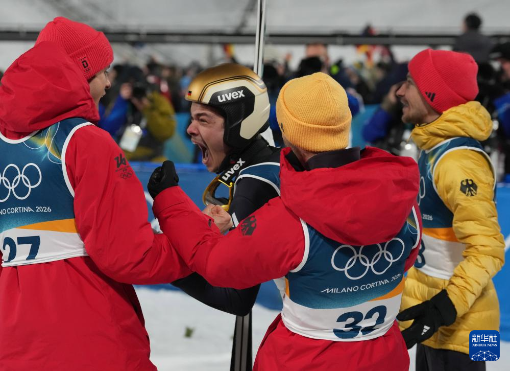 2月9日,德国选手菲利普·雷蒙德(左二)在比赛后庆祝。他获得冠军。