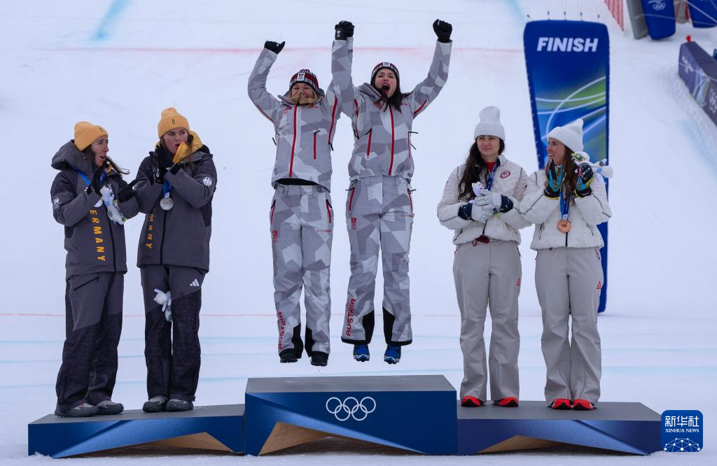 2月10日,冠军奥地利2队组合雷德勒(左三)/胡贝尔(右三)在颁奖仪式上跳上领奖台。
