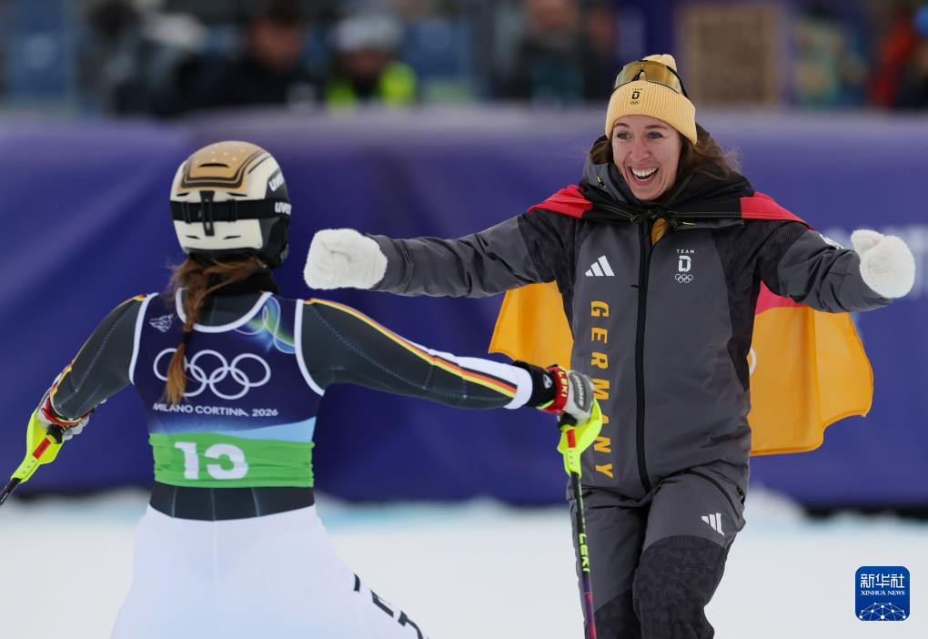 2月10日,德国队选手魏德勒·温克尔曼(右)在比赛后迎接队友艾歇尔。德国队魏德勒·温克尔曼/艾歇尔组合获得亚军。