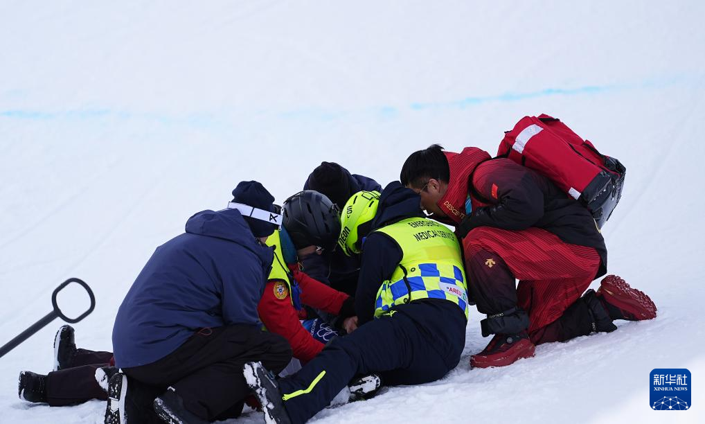 2月11日,中国选手刘佳宇摔倒受伤后,医务人员第一时间进场检查。