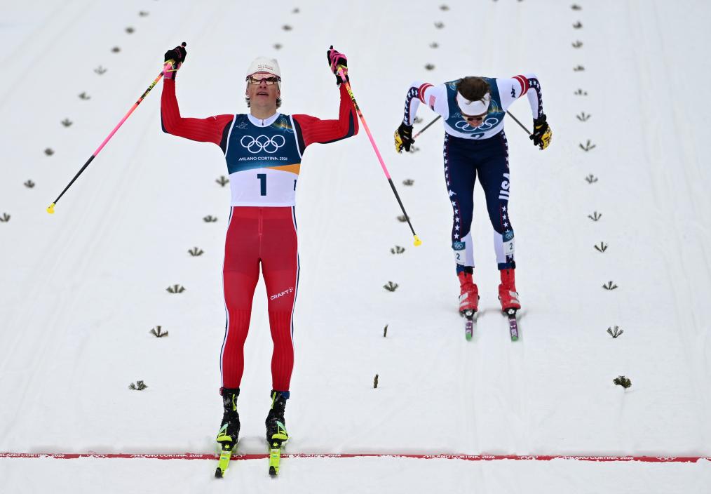 2月10日,挪威选手克莱博(左)在冲过终点后庆祝。新华社记者 贺灿铃 摄