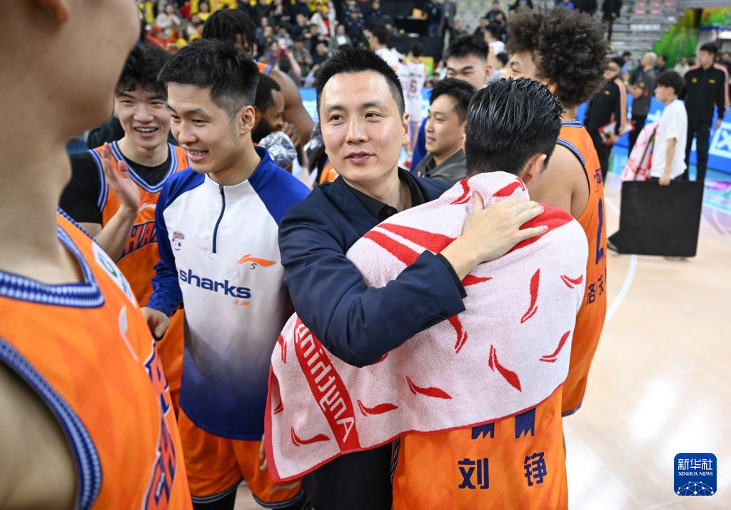 2月12日,上海久事队主教练卢伟(前右二)与球员刘铮(前右一)在赛后拥抱。