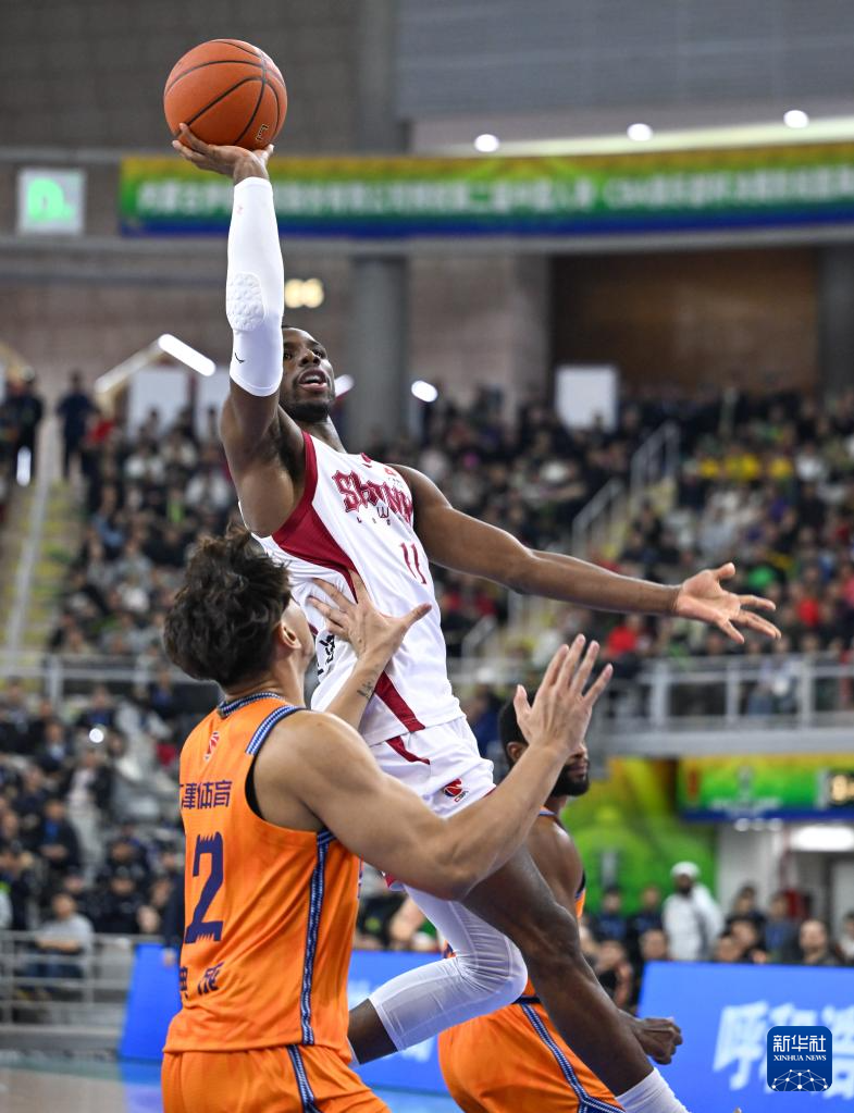 2月12日,上海久事队球员怀特塞德(中)在比赛中扣篮得分。
