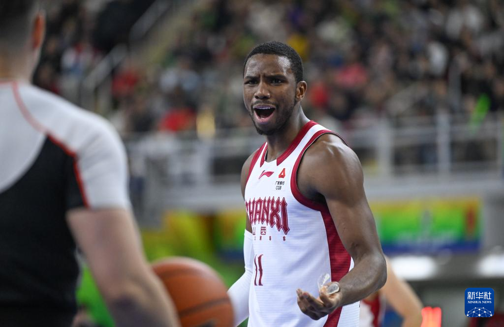 2月12日,山西汾酒队球员迪亚洛(右)在比赛中与裁判沟通。