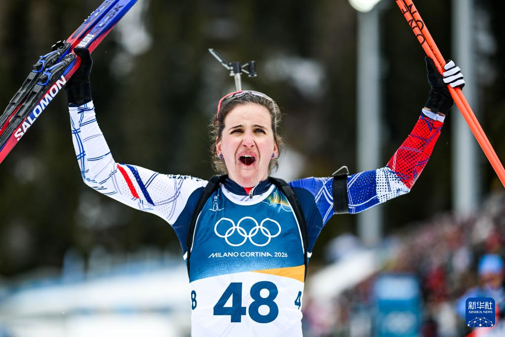 2月11日,法国选手西蒙在比赛中冲线后庆祝。她获得冠军。