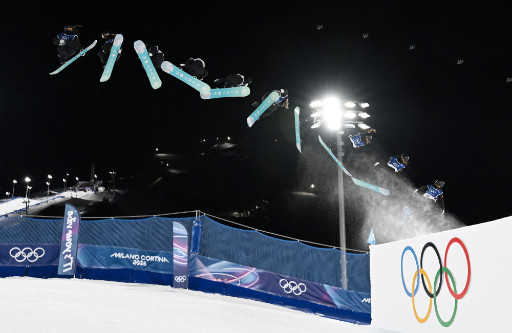 2月9日,张小楠在单板滑雪项目女子大跳台决赛中(多重曝光照片)。新华社记者 夏一方 摄