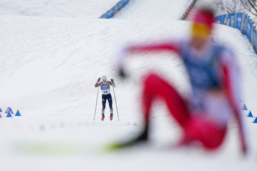 2月10日,获得越野滑雪男子个人短距离(传统技术)冠军的挪威选手克莱博(前)在冲线前回看身后的运动员。新华社记者 彭子洋 摄