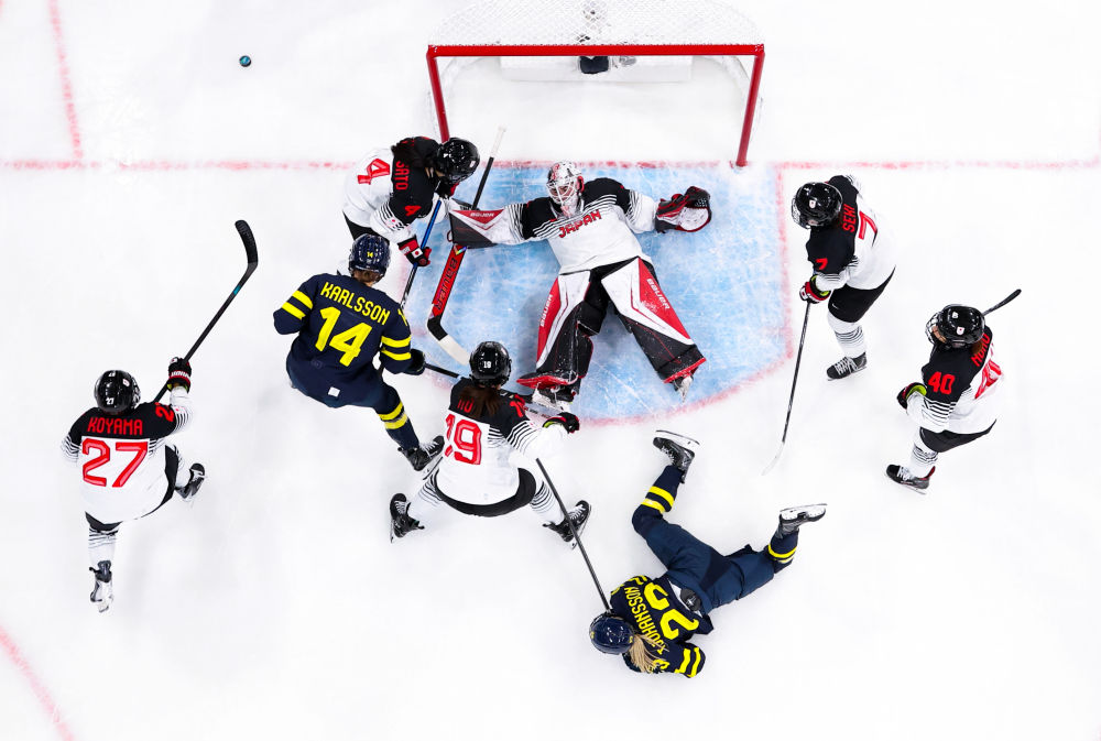 2月10日,瑞典队与日本队选手在冰球项目女子小组赛中拼抢。新华社记者 陶希夷 摄