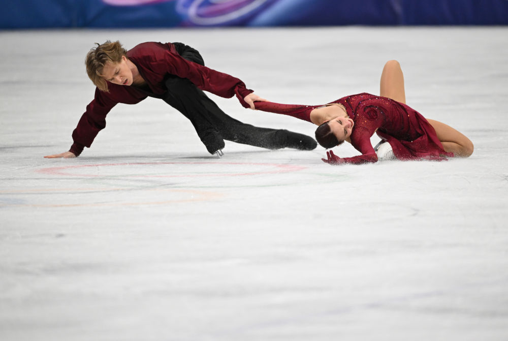 2月11日,美国组合乔克(上)/贝茨在花样滑冰项目冰上舞蹈自由舞比赛中。新华社记者 程敏 摄