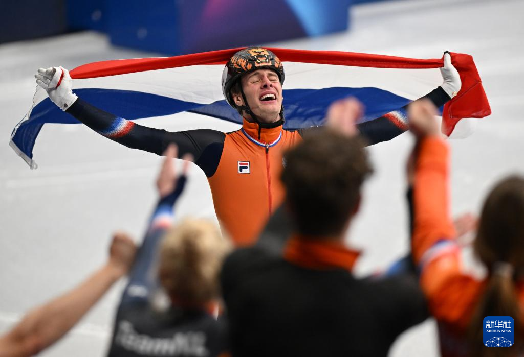2月12日,冠军荷兰选手范特沃特在比赛后身披国旗庆祝。